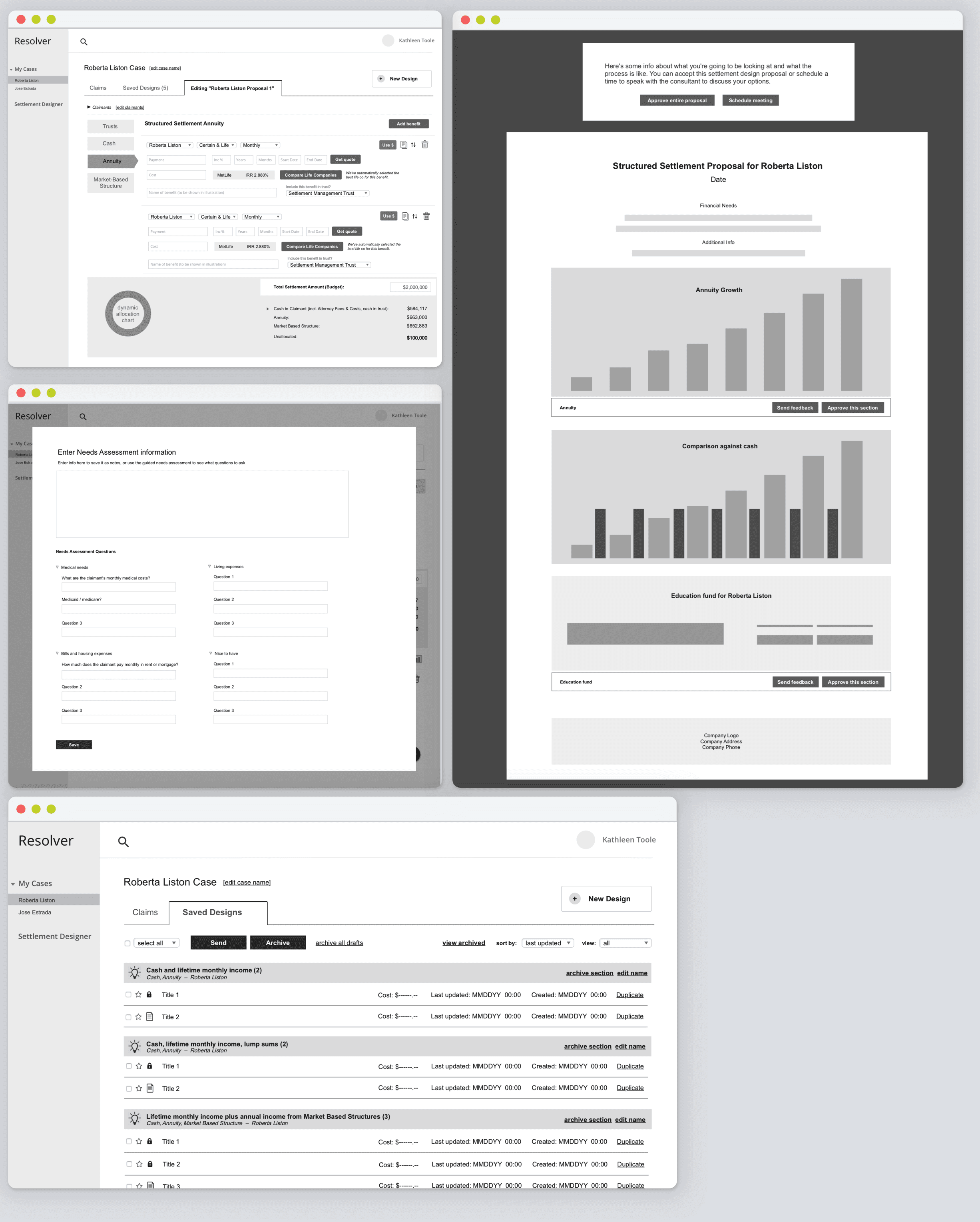 Their business is structured settlements, so the software is used by their settlement consultants to prepare and compare different combinations of timelines and financial vehicles in order to develop a quote for the best structure for the claimant. Their legacy product was a piece of desktop Windows software that had been built in the 90s and was still in use. IFS wanted to upgrade their product to a modern web experience, and while they were at it, re-think a lot of how the software operated.
