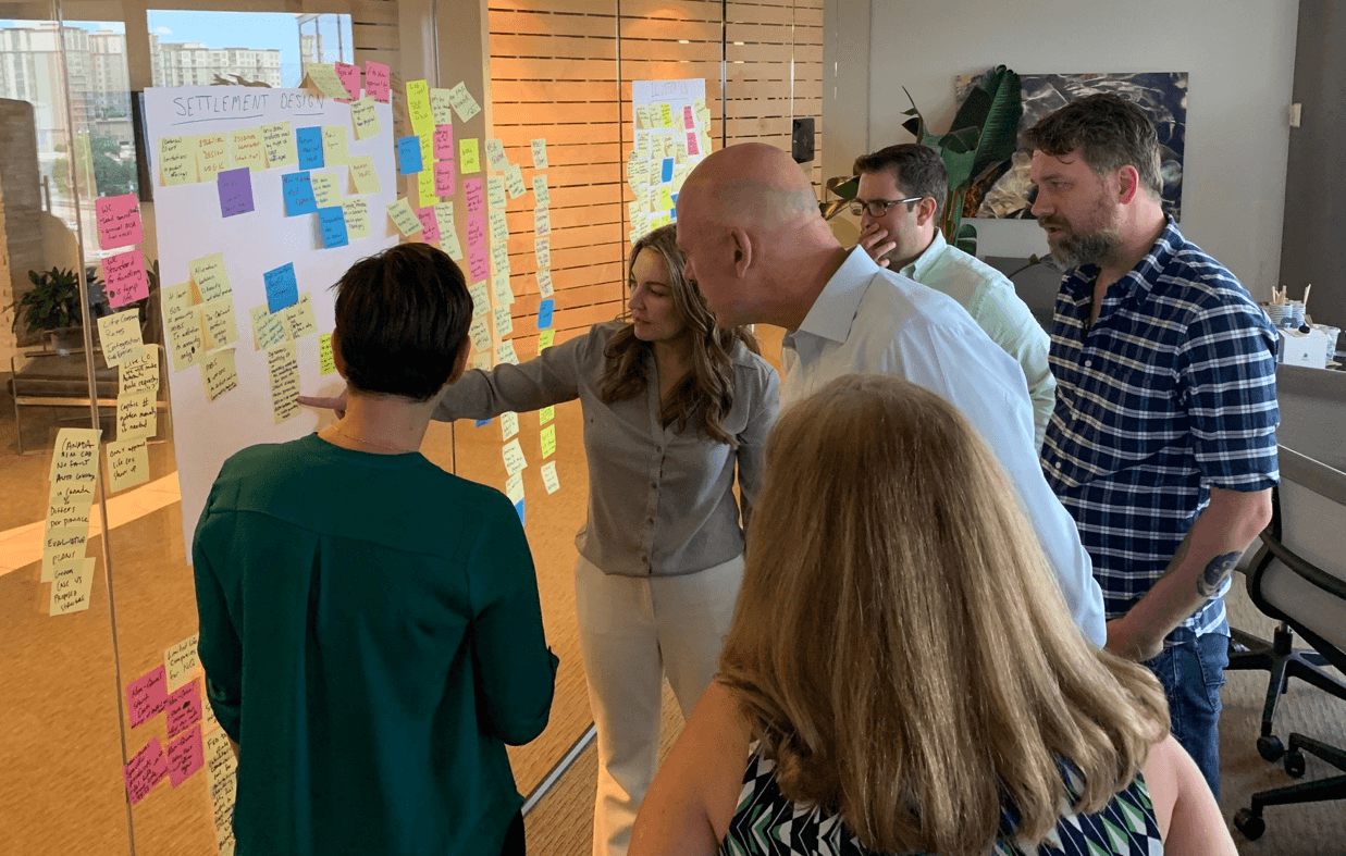 This day was dedicated to building a group understanding of the problem we’d be solving over the next few days. Through discussing a series of problem statements focused on different jobs to be done (e.g. “As a settlement consultant, I need to complete an assessment of the client’s needs.”) the group was able to share knowledge across each of their specific domains. I facilitated this discussion and had the participants capture ideas on post-it notes then work together to organize them thematically. When we were done, we had a ton of great ideas stuck up on the wall and sorted into key focus areas.
