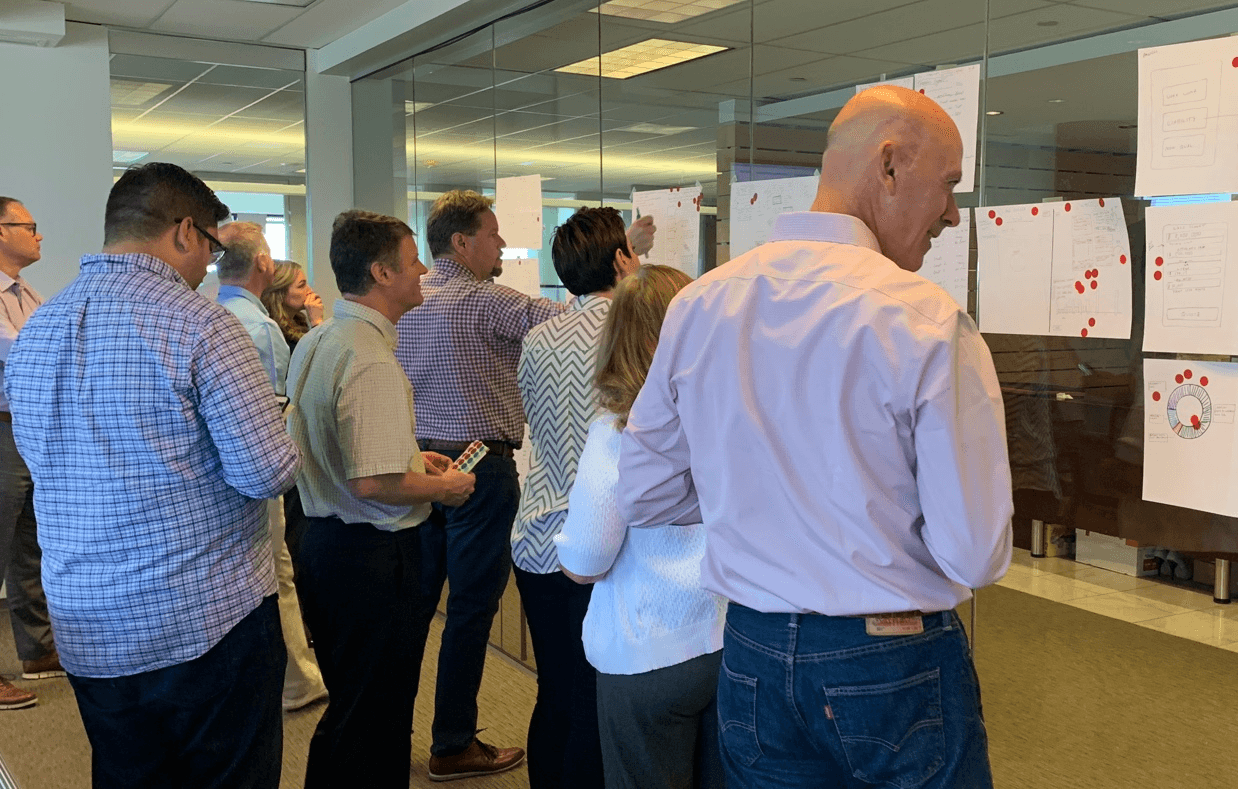 Participants from non-design backgrounds were empowered to create their own UI sketches and decide on the best ideas with a dot voting system.
